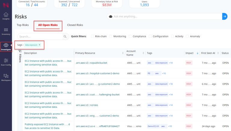You will be redirected to the All Open Risks section with the preset filter tags: data-exposure.