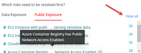 From the Public Exposure tab, select View all to display the entire list of entities that are determined to be publicly accessible.