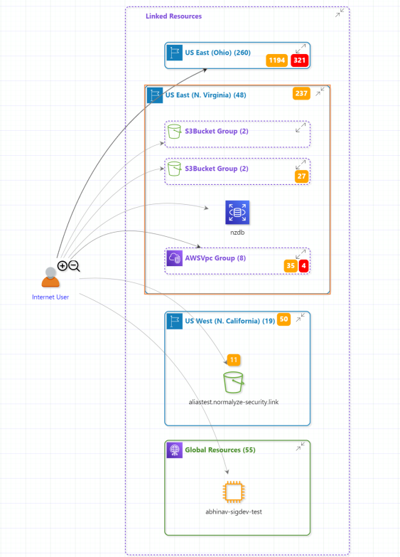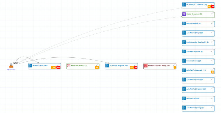 For example: The visualization would show how a EC2 instance in a specific region can be reached from any other points / regions / entities from that account or from outside (anonymous access).