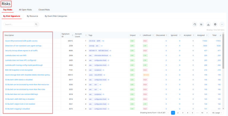 Every asset or resource that is detected to have any potential configuration or data related issue is categorized based on the corresponding Risk Signature that matches the issue.