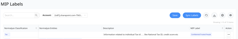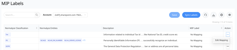 - Normalyze Entities -This column lists the entities that are attached with each of the classification. This is not applicable for custom entities since they cannot be attached to a Data Classification label.