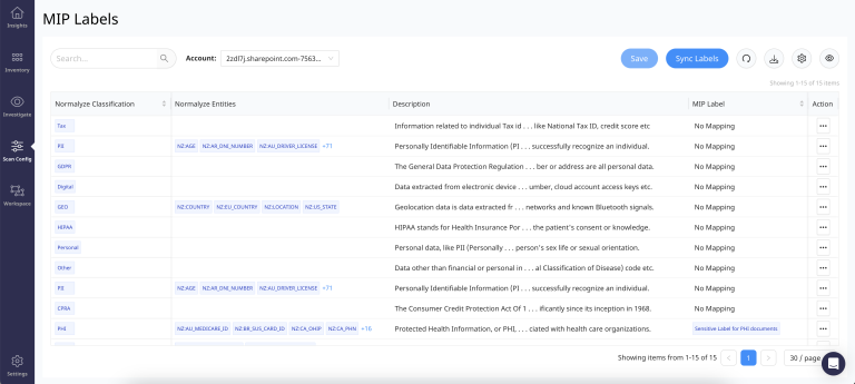 - MIP Label - This column shows if the DSPM data classification is mapped to a specific MIP label or not. If there are no mapping, then it shows "No Mapping" and when the mapping is setup, it shows the name of the "Sensitivity Label" as defined on the Purview platform.