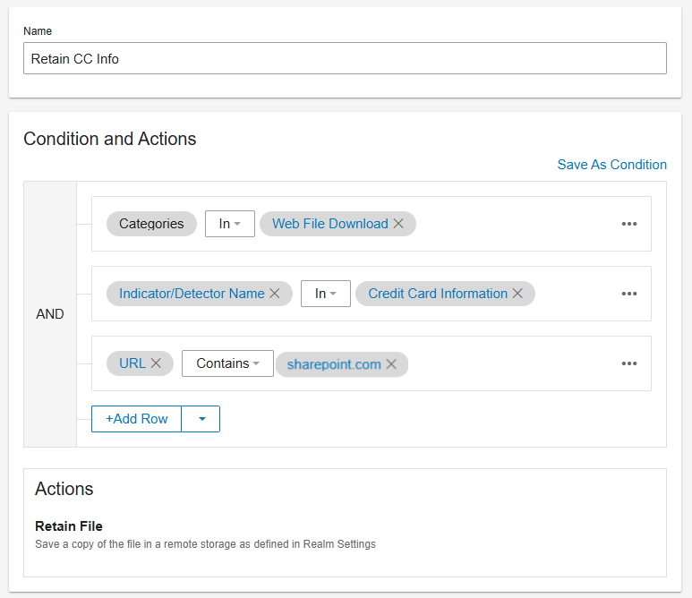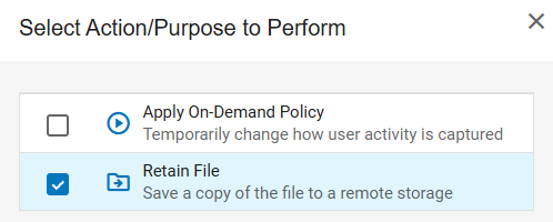 The Retain File action uses the same underlying mechanism as file retention in Prevention Rules, relying on existing configurations in the Administration app.
